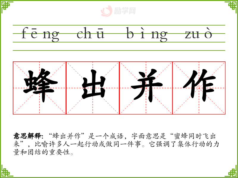 通过对“蜂出并作”的学,我更加意识到团结合作在生活和工作中的重要性。这不仅是语言学中的一部分,更是对人际关系和社会交往的深刻理解。这个成语提醒我在日常生活中,要重视团队合作,并努力成为一个能够带动他人的人。