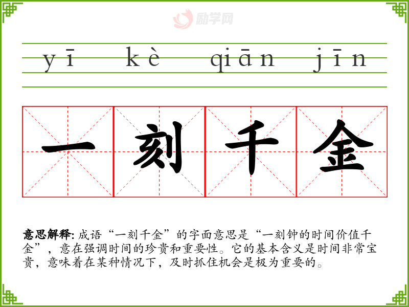 通过对“一刻千金”的学*,我更加深刻地理解了时间的重要性,也意识到在日常生活和工作中如何更有效地利用时间。这不仅提升了我的时间管理能力,也丰富了我的表达方式,使我在与他人沟通时,能够更准确地传达时间的价值。
