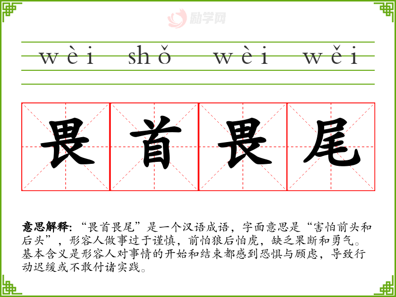 “畏首畏尾”是一个汉语成语,字面意思是“害怕前头和后头”,形容人做事过于谨慎,前怕狼后怕虎,缺乏果断和勇气。基本含义是形容人对事情的开始和结束都感到恐惧与顾虑,导致行动迟缓或不敢付诸实践。