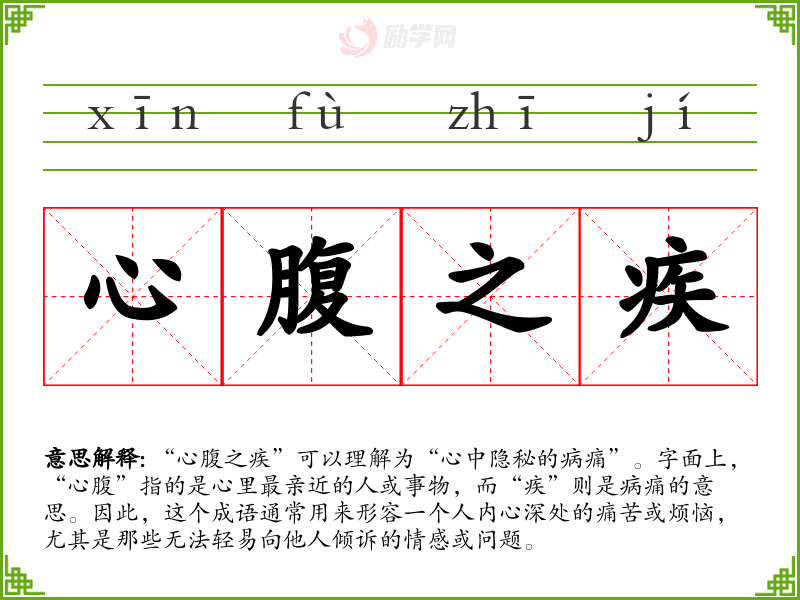 “心腹之疾”作为一个成语,不仅丰富了我们的语言表达,更深入了我们对心理状态的理解。它提醒我们关注内心的声音,鼓励我们在面对烦恼时,要勇于表达和寻求帮助。在语言学习中,掌握这样的成语,可以增强我们的表达力和情感共鸣。