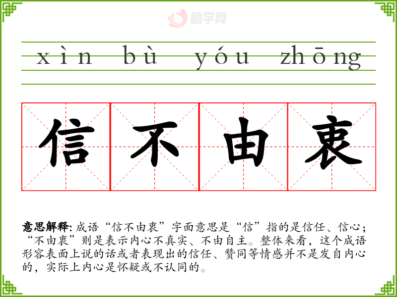 成语“信不由衷”字面意思是“信”指的是信任、信心;“不由衷”则是表示内心不真实、不由自主。整体来看,这个成语形容表面上说的话或者表现出的信任、赞同等情感并不是发自内心的,实际上内心是怀疑或不认同的。