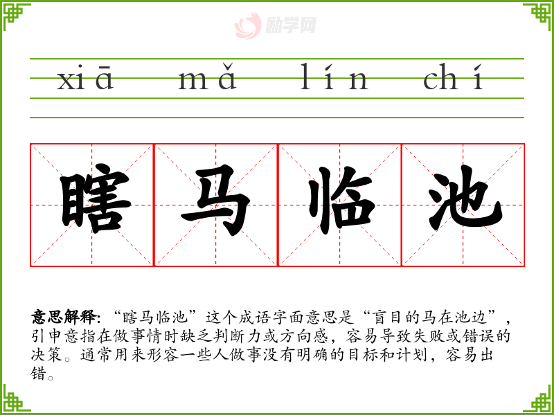 “瞎马临池”这个成语字面意思是“盲目的马在池边”,引申意指在做事情时缺乏判断力或方向感,容易导致失败或错误的决策。通常用来形容一些人做事没有明确的目标和计划,容易出错。