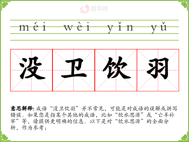 成语“没卫饮羽”并不常见,可能是对成语的误解或拼写错误。如果您是指某个其他的成语,比如“饮水思源”或“亡羊补牢”等,请提供更明确的信息。以下是对“饮水思源”的全面分析,作为参考: