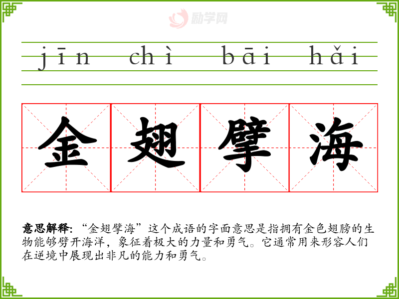 “金翅擘海”这个成语的字面意思是指拥有金色翅膀的生物能够劈开海洋,象征着极大的力量和勇气。它通常用来形容人们在逆境中展现出非凡的能力和勇气。