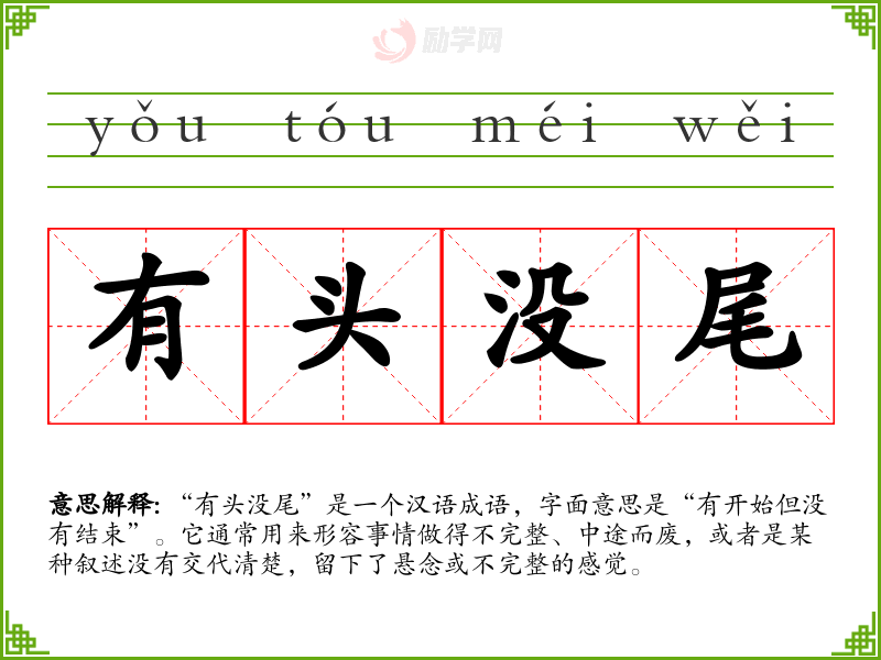 “有头没尾”是一个汉语成语,字面意思是“有开始但没有结束”。它通常用来形容事情做得不完整、中途而废,或者是某种叙述没有交代清楚,留下了悬念或不完整的感觉。
