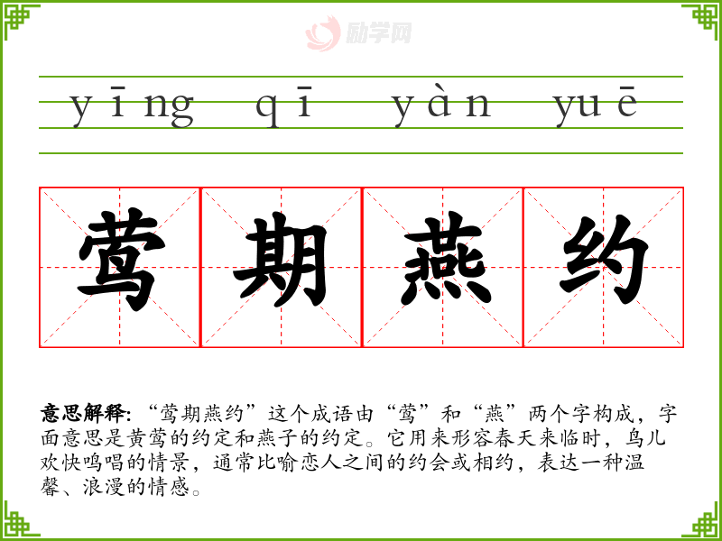 “莺期燕约”这个成语由“莺”和“燕”两个字构成,字面意思是黄莺的约定和燕子的约定。它用来形容春天来临时,鸟儿欢快鸣唱的情景,通常比喻恋人之间的约会或相约,表达一种温馨、浪漫的情感。