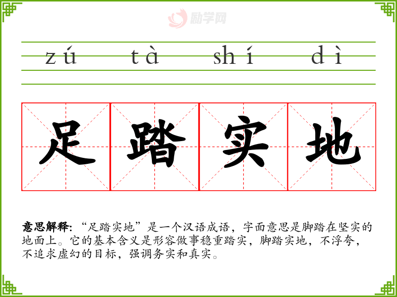 通过对“足踏实地”的学,我认识到在追求梦想的过程中,务实的心态不仅能够帮助我保持清晰的方向,也能让我在面对困难时更加从容。这一成语在语言学和日常表达中,提醒我始终保持真实和务实,避免被表象所迷惑。