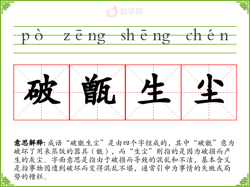 成语“破甑生尘”是由四个字组成的,其中“破甑”意为破坏了用来蒸饭的器具(甑),而“生尘”则指的是因为破损而产生的灰尘。字面意思是指由于破损而导致的混乱和不洁,基本含义是指事物因遭到破坏而变得混乱不堪,通常引申为事情的失败或局势的糟糕。