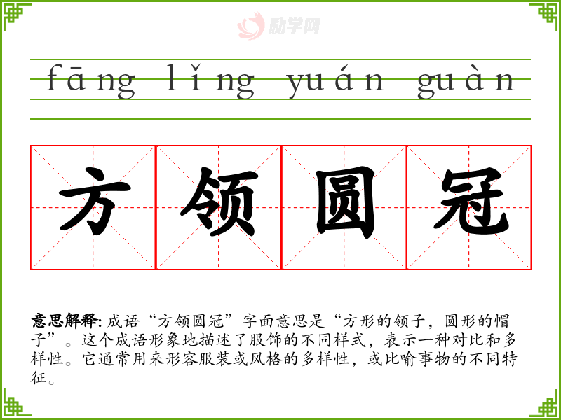 通过对“方领圆冠”的学,我认识到多样性不仅体现在服饰上,也体现在思想和文化中。这个成语提醒我在语言学和表达中,关注不同的观点和风格,尊重和欣赏每一种独特的表达方式。这在我未来的沟通中将是一个重要的原则。