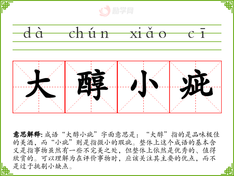 成语“大醇小疵”字面意思是:“大醇”指的是品味极佳的美酒,而“小疵”则是指微小的瑕疵。整体上这个成语的基本含义是指事物虽然有一些不完美之处,但整体上依然是优秀的、值得欣赏的。可以理解为在评价事物时,应该关注其主要的优点,而不是过于挑剔小缺点。