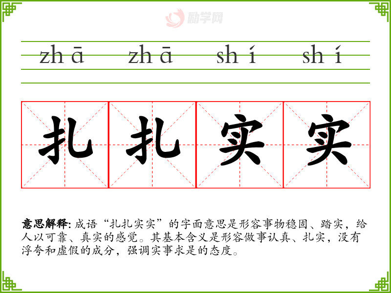 通过对“扎扎实实”这个成语的学,我深刻理解了在语言表达中扎实、真实的重要性。这不仅适用于我的学和工作,也影响了我对待生活的态度,促使我在各种情境中都追求真实和扎实的表现。