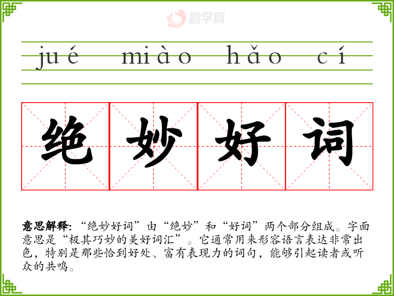 “绝妙好词”由“绝妙”和“好词”两个部分组成。字面意思是“极其巧妙的美好词汇”。它通常用来形容语言表达非常出色,特别是那些恰到好处、富有表现力的词句,能够引起读者或听众的共鸣。