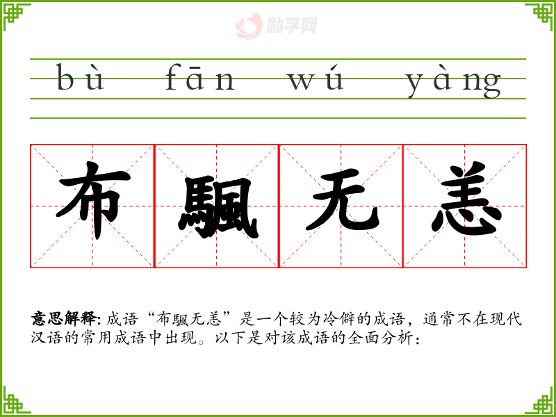 成语“布颿无恙”是一个较为冷僻的成语,通常不在现代汉语的常用成语中出现。以下是对该成语的全面分析: