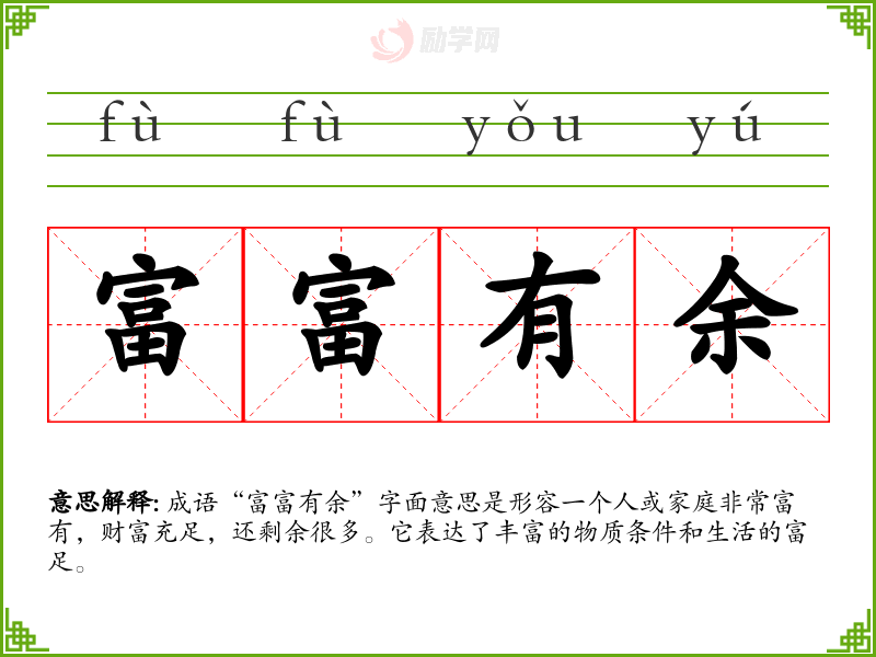 成语“富富有余”字面意思是形容一个人或家庭非常富有,财富充足,还剩余很多。它表达了丰富的物质条件和生活的富足。