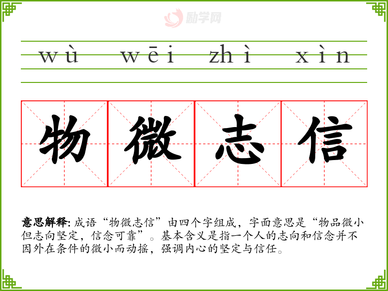 成语“物微志信”由四个字组成,字面意思是“物品微小但志向坚定,信念可靠”。基本含义是指一个人的志向和信念并不因外在条件的微小而动摇,强调内心的坚定与信任。