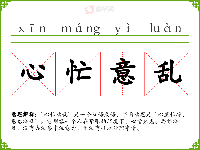 “心忙意乱”是一个汉语成语,字面意思是“心里忙碌,意念混乱”。它形容一个人在紧张的环境下,心情焦虑、思维混乱,没有办法集中注意力,无法有效地处理事情。
