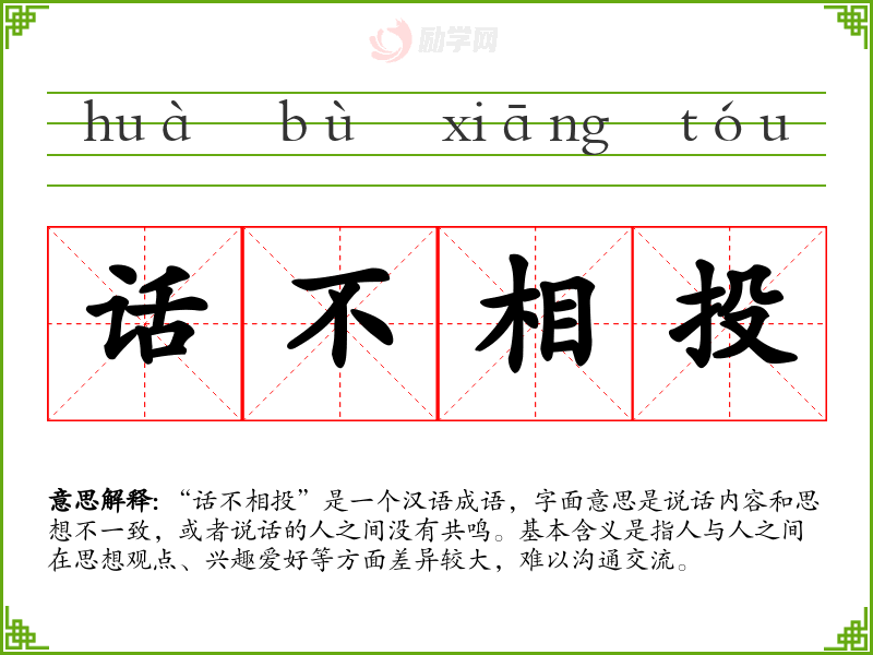 “话不相投”是一个汉语成语,字面意思是说话内容和思想不一致,或者说话的人之间没有共鸣。基本含义是指人与人之间在思想观点、兴趣爱好等方面差异较大,难以沟通交流。