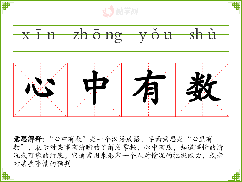 “心中有数”是一个汉语成语,字面意思是“心里有数”,表示对某事有清晰的了解或掌握,心中有底,知道事情的情况或可能的结果。它通常用来形容一个人对情况的把握能力,或者对某些事情的预判。