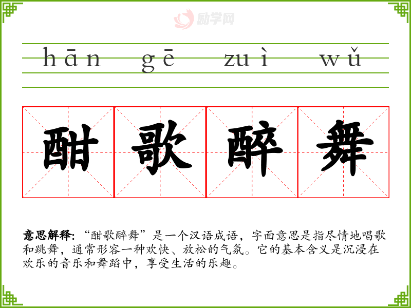 “酣歌醉舞”是一个汉语成语,字面意思是指尽情地唱歌和跳舞,通常形容一种欢快、放松的气氛。它的基本含义是沉浸在欢乐的音乐和舞蹈中,享受生活的乐趣。