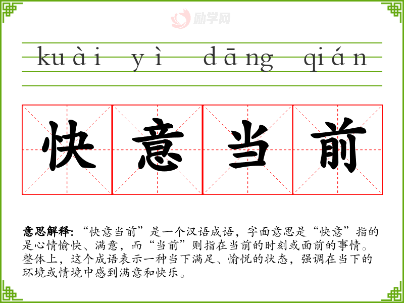 通过对“快意当前”的学,我对生活的态度有了更深的理解。这个成语提醒我们在繁忙的生活中,不要忘记享受当下的美好。在语言学和表达中,掌握这样的成语不仅丰富了我的词汇,也让我在交流时更能够传达出积极的情感和态度。