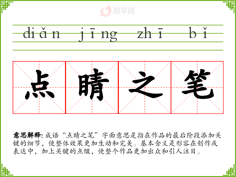 成语“点睛之笔”字面意思是指在作品的最后阶段添加关键的细节,使整体效果更加生动和完美。基本含义是形容在创作或表达中,加上关键的点缀,使整个作品更加出众和引人注目。