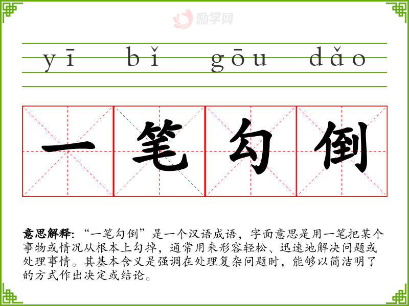 “一笔勾倒”是一个汉语成语,字面意思是用一笔把某个事物或情况从根本上勾掉,通常用来形容轻松、迅速地解决问题或处理事情。其基本含义是强调在处理复杂问题时,能够以简洁明了的方式作出决定或结论。