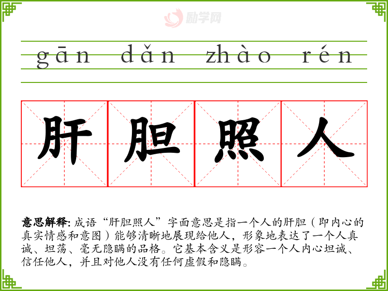 通过对成语“肝胆照人”的学,我更加理解了真诚在生活和人际交往中的重要性。这个成语提醒我,无论是学还是工作,都要保持诚实与信任,这不仅有助于建立良好的关系,也能让自己的人生更加充实。