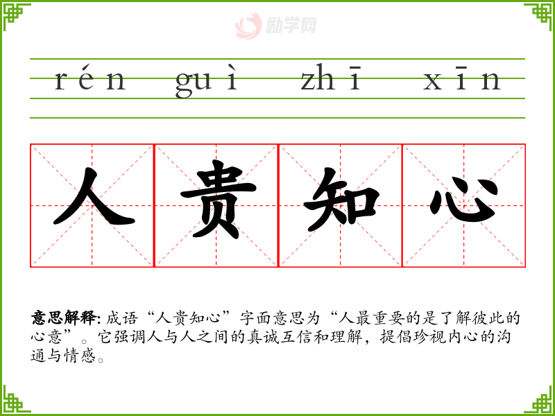 “人贵知心”让我认识到在沟通中,真诚与理解是建立良好关系的基础。在语言学和表达中,理解他人的情感和意图不仅可以增进人际关系,还能提升我们的沟通能力。这一成语的学让我更加关注与他人的心灵交流,提升了我的情商和社交能力。