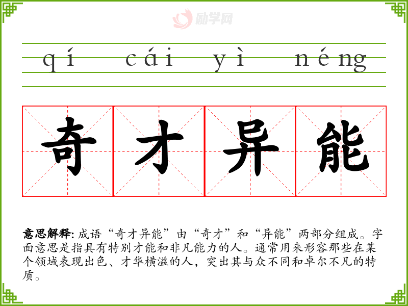 成语“奇才异能”由“奇才”和“异能”两部分组成。字面意思是指具有特别才能和非凡能力的人。通常用来形容那些在某个领域表现出色、才华横溢的人,突出其与众不同和卓尔不凡的特质。