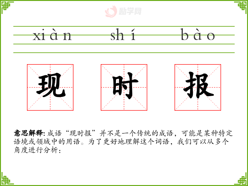成语“现时报”并不是一个传统的成语,可能是某种特定语境或领域中的用语。为了更好地理解这个词语,我们可以从多个角度进行分析: