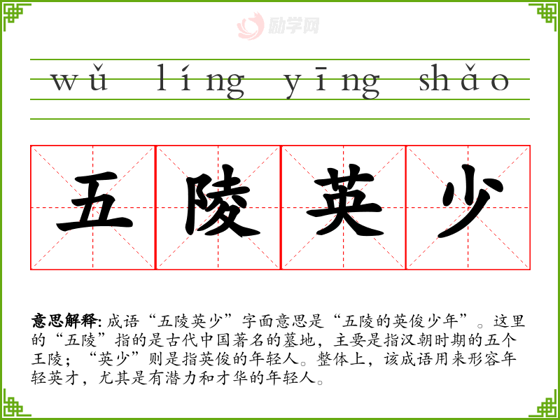 在文学作品中,“五陵英少”常用于描绘年轻的英雄或有才华的人物,强调他们的年轻和潜力。在日常对话中,可以用来称赞年轻人的能力和未来发展。在演讲中,使用该成语可以激励年轻人追求自己的理想和目标。