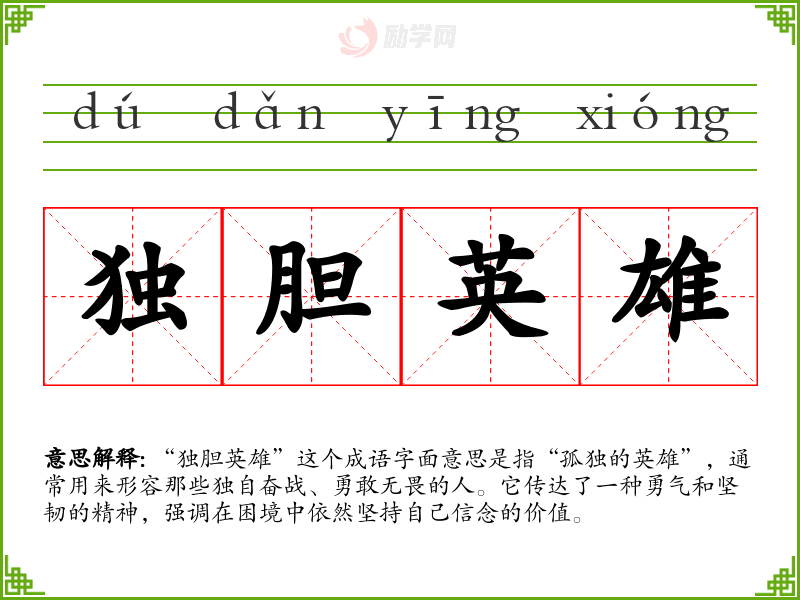 “独胆英雄”这个成语字面意思是指“孤独的英雄”,通常用来形容那些独自奋战、勇敢无畏的人。它传达了一种勇气和坚韧的精神,强调在困境中依然坚持自己信念的价值。