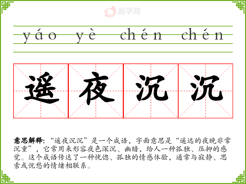 通过对“遥夜沉沉”的学*,我深刻理解了成语在语言表达中的重要性。它不仅仅是语言的装饰,更是情感的载体,能够有效地传递复杂的心理状态和情感体验。在日常交流和写作中,运用这样的成语能够使表达更加生动和有深度。