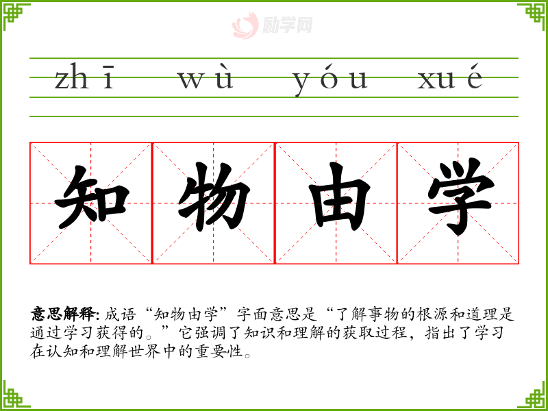 成语“知物由学”字面意思是“了解事物的根源和道理是通过学获得的。”它强调了知识和理解的获取过程,指出了学在认知和理解世界中的重要性。
