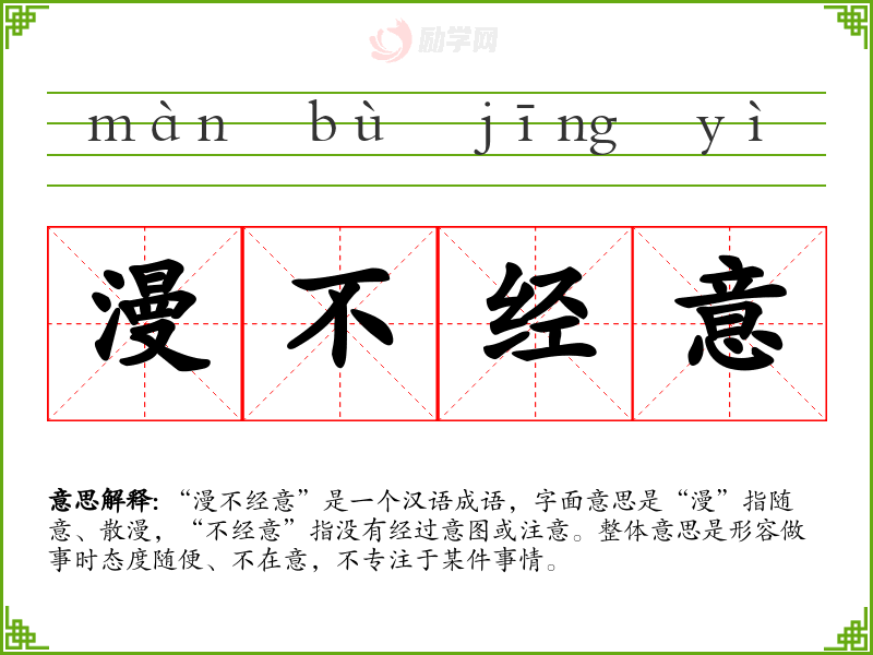 “漫不经意”是一个汉语成语,字面意思是“漫”指随意、散漫,“不经意”指没有经过意图或注意。整体意思是形容做事时态度随便、不在意,不专注于某件事情。