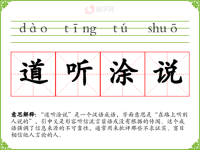 - 演讲:演讲者在倡导理性思考时,可能会提到这个成语,以呼吁听众验证信息源:“在信息泛滥的时代,我们更要警惕道听涂说。”