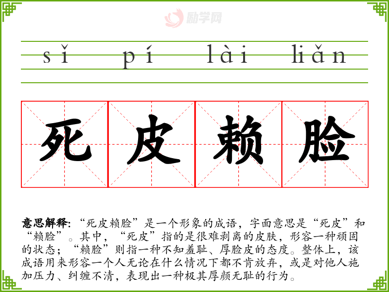 - 日常对话:朋友之间开玩笑或批评某人时,常用“死皮赖脸”来形容某人的行为。