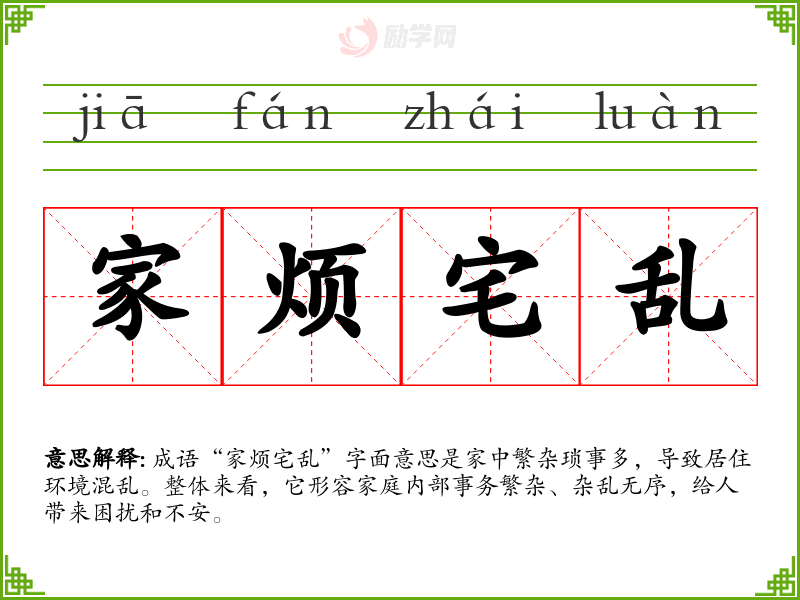 “家烦宅乱”让我联想到家庭生活中的琐碎事务,常常让人感到疲惫和烦恼。它也体现了一种对家庭和谐的期盼,提醒我们在忙碌的生活中不要忽视家庭的管理与维护。