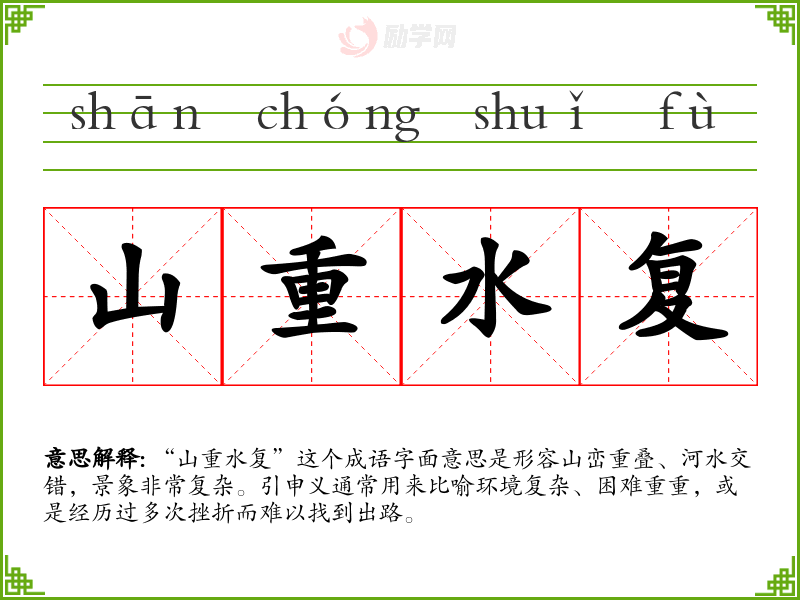 “山重水复”这个成语字面意思是形容山峦重叠、河水交错,景象非常复杂。引申义通常用来比喻环境复杂、困难重重,或是经历过多次挫折而难以找到出路。