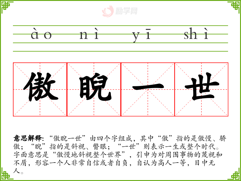 通过对“傲睨一世”的深入学,我认识到自信与傲慢之间的微妙界限。在语言学和表达中,掌握这些成语不仅丰富了我的词汇,也让我更加敏感于人与人之间的关系和情感表达。这让我在表达自己观点时,学会了更为谨慎和谦逊。