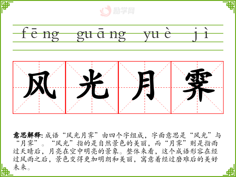 通过对“风光月霁”的学,我意识到它不仅仅是一个成语,更是对生活态度的反映。在语言学中,理解和运用成语能够丰富我们的表达,使语言更加生动和有力。这个成语让我更加珍视经历中的每一次挑战,因为它们都是通往美好未来的必经之路。