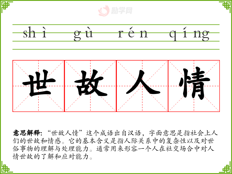 通过对“世故人情”的学*,我认识到在日常生活和社交中,理解人际关系的重要性以及如何更好地与他人相处。这一成语不仅丰富了我的语言表达,也让我在社交中更为自信。