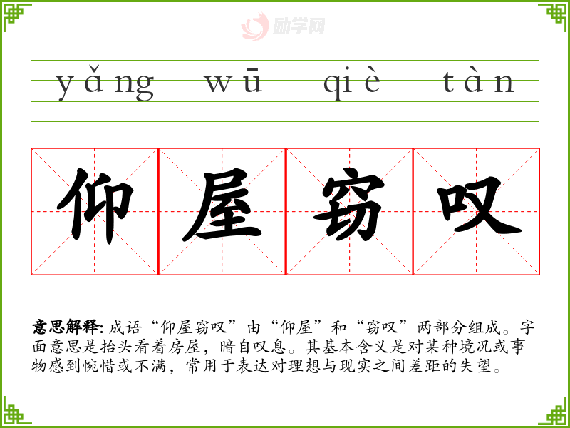 成语“仰屋窃叹”由“仰屋”和“窃叹”两部分组成。字面意思是抬头看着房屋,暗自叹息。其基本含义是对某种境况或事物感到惋惜或不满,常用于表达对理想与现实之间差距的失望。