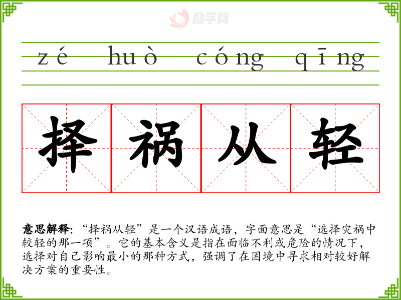 通过对“择祸从轻”的学*,我意识到在生活中做出选择时,保持冷静、理智以及对后果的敏感是非常重要的。这个成语不仅丰富了我的语言表达,也为我提供了应对困境的智慧。