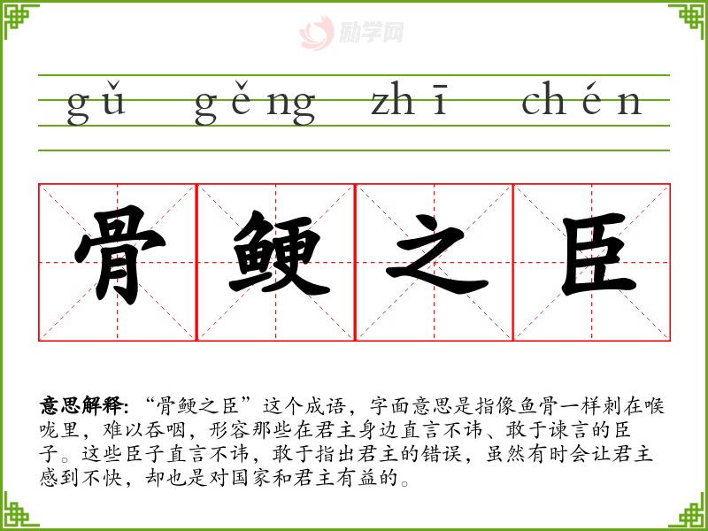 “骨鲠之臣”这个成语,字面意思是指像鱼骨一样刺在喉咙里,难以吞咽,形容那些在君主身边直言不讳、敢于谏言的臣子。这些臣子直言不讳,敢于指出君主的错误,虽然有时会让君主感到不快,却也是对国家和君主有益的。