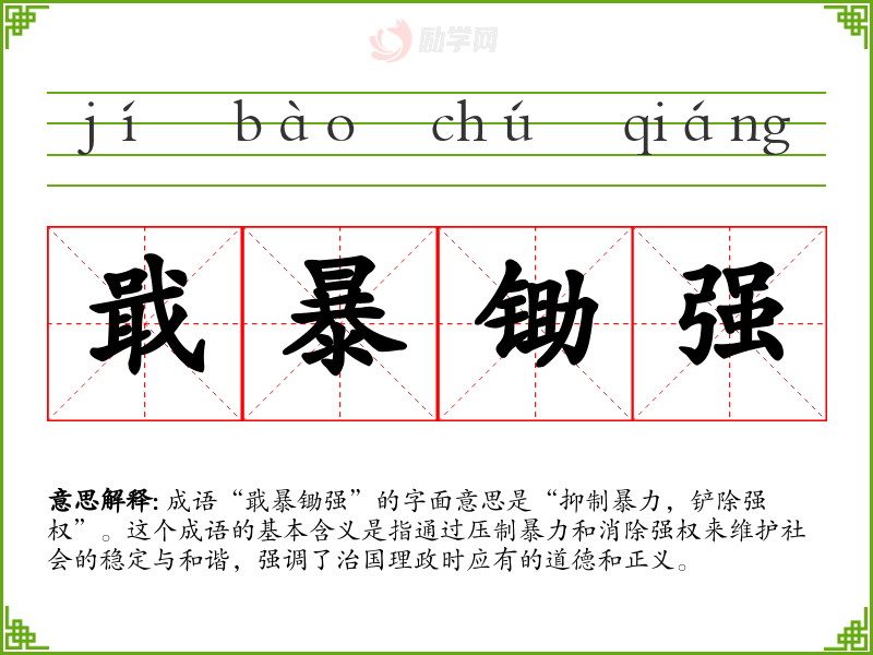 - 反义成语:助纣为虐、横行霸道。它们则表达了对暴力与强权的支持和纵容,与“戢暴锄强”的核心意义相反。