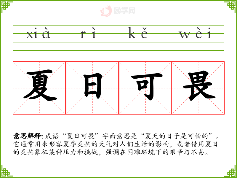 通过对“夏日可畏”的学,我更加明白了语言中蕴含的文化与情感。这个成语不仅仅是对天气的描述,更是人们在面对自然挑战时所产生的深刻感悟。在我的语言学和表达中,理解成语的背景与情感,有助于我更好地与他人沟通和交流。
