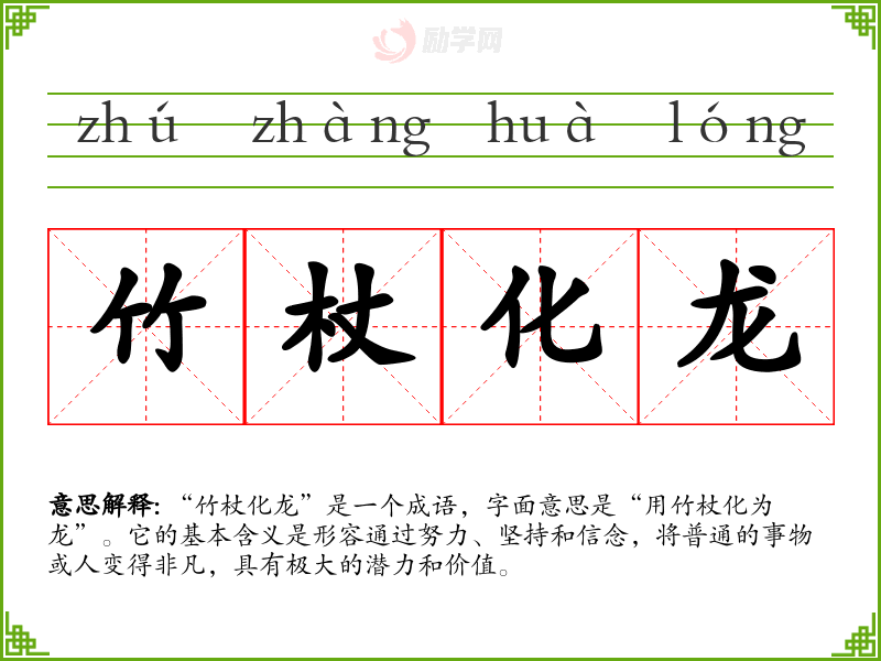这个成语源自**古代的传说和文学作品,通常与道教文化有关。在一些故事中,竹杖是修行者的象征,而“化龙”则代表着修行者通过艰苦的努力和修行,最终实现了自己的理想与目标。这个成语常常被用来鼓励他人,强调坚持和努力的重要性。