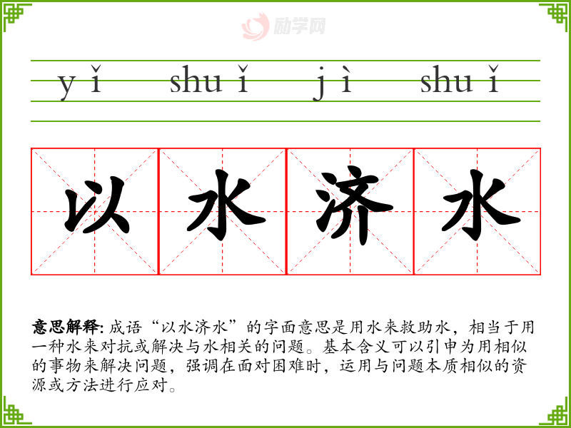 成语“以水济水”的字面意思是用水来救助水,相当于用一种水来对抗或解决与水相关的问题。基本含义可以引申为用相似的事物来解决问题,强调在面对困难时,运用与问题本质相似的资源或方法进行应对。