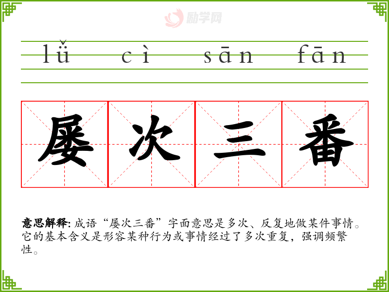 成语“屡次三番”字面意思是多次、反复地做某件事情。它的基本含义是形容某种行为或事情经过了多次重复,强调频繁性。